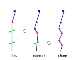 The pedals each affect the tuning of the strings in a particular pitch class. “Each pedal is attached to a rod or cable within the column of the harp, which then connects with a mechanism within the neck. When a pedal is moved with the foot, small discs at the top of the harp rotate. The discs are studded with two pegs that pinch the string as they turn, shortening the vibrating length of the string. The tip of a string is shown in blue. Points in contact with the string are shown in red. Points not in contact with the string are in green”.[3]