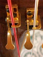 Designed in the 1980s by Peter Brough of Britain, these are very solid cast bronze which minimizes distortion. Notice the “offsets” in the picture which makes them easily accessible for regulation. The design – an inclined pivot on a machine screw – ingeniously uses string tension to hold the fret to the end stop. Still a very popular lever, though not as often seen in the US as in Europe. Peter makes these available to other luthiers and those that use them rave about them. They require ¼” bridge pin height – versus the more common ½” for levers such as Loveland and Truitt. The offset design and smooth action allow a player to change several simultaneously with ease.