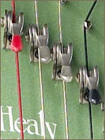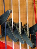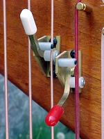 These levers are usually installed on Josephus rental instruments, but may occasionally be found on used harps. Like Robinsons and Loveland levers, these work by engaging the string vertically. Designed specifically for mid and bass range strings; two frets engage the string which minimizes distortion or scraping/buzzing noise that can occur with single point action.