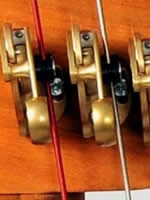 Considered by many to be the “Cadillac” of vertical action levers, Truitts are easily mounted and regulated. Constructed of solid brass with gold plating, the levers include a variety of frets and stop pins for different string sizes, lengths, and compositions. The levers are held to the neck with two Torx machine screws (one in the very high treble). Little or no tone distortion is present. Some players find the handles difficult to see.